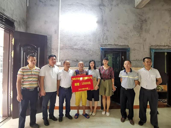 緊接著,海南萬泰領導一行來到龍塘鎮新民村委會北喜村的低保貧困戶符執仲家中。符執仲家里只有他和他的兒子,小孩還在上學,家境貧寒,每月依靠領取的低保金過日子,沒有能力將新房建好。海南萬泰本著踐行愛心扶貧精神,捐贈10000元給符執仲支持建設新房。符執仲表示感謝海南萬泰建筑工程公司,今后會依靠雙手,努力賺錢,爭取早日脫貧。