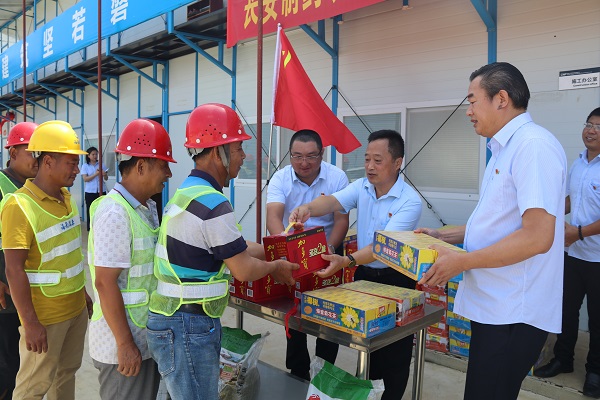 揭牌儀式結束后,結合“送清涼,戰酷暑”省建設工會在行動,傅愛萍副書記與長安制藥黨支部書記汪立冬、萬泰工會主席顏利代表省建設工會和海南萬泰工會為項目工友送上了一份份防暑降溫慰問品,為辛勤堅守在一線工作崗位上的勞動者帶來絲絲“清涼”,也表達了對一線職工的關懷。